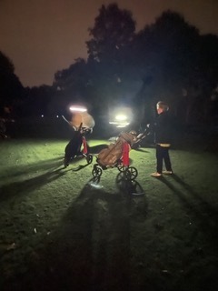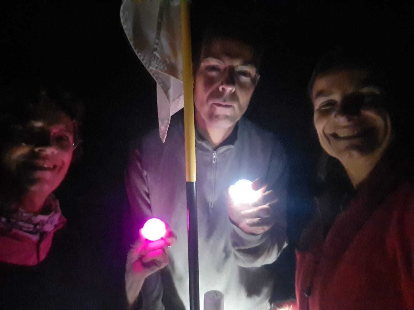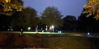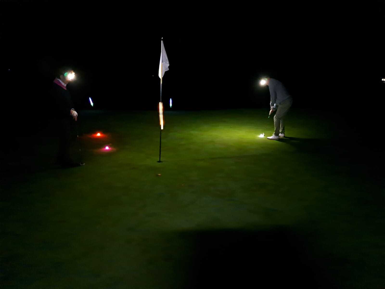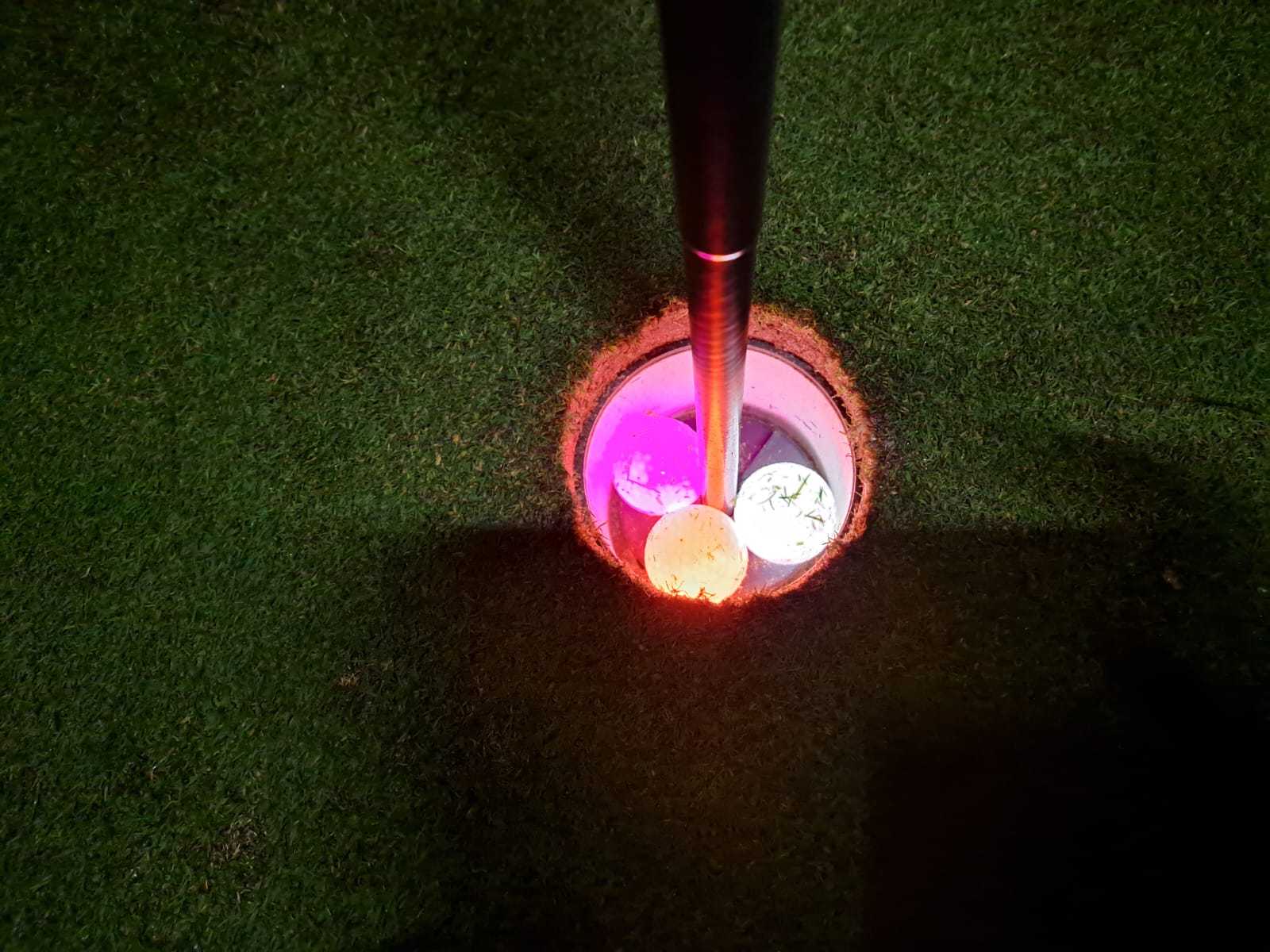 We waren letterlijk getooid met sterke lichtstralen, en daardoor zag je zeker de aankomende 5 meter. En je hielp elkaar natuurlijk met bijschijnen en advies, want dat kan natuurlijk bij gezelligheidswedstrijd! We genoten van alle verlichte gekleurde staven bij de afslagplaatsen, hindernissen en greens en holes! Wat moet dat een werk zijn geweest om dat voor te bereiden en neer te zetten !