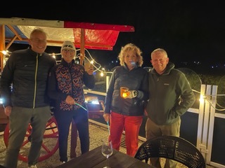 We waren letterlijk getooid met sterke lichtstralen, en daardoor zag je zeker de aankomende 5 meter. En je hielp elkaar natuurlijk met bijschijnen en advies, want dat kan natuurlijk bij gezelligheidswedstrijd! We genoten van alle verlichte gekleurde staven bij de afslagplaatsen, hindernissen en greens en holes! Wat moet dat een werk zijn geweest om dat voor te bereiden en neer te zetten !
